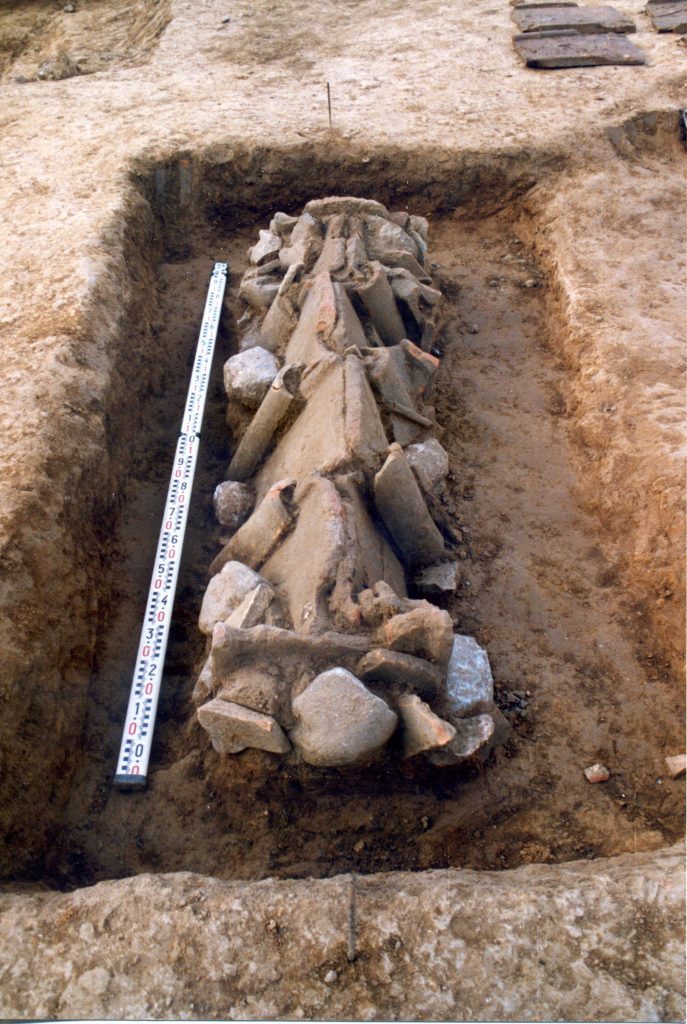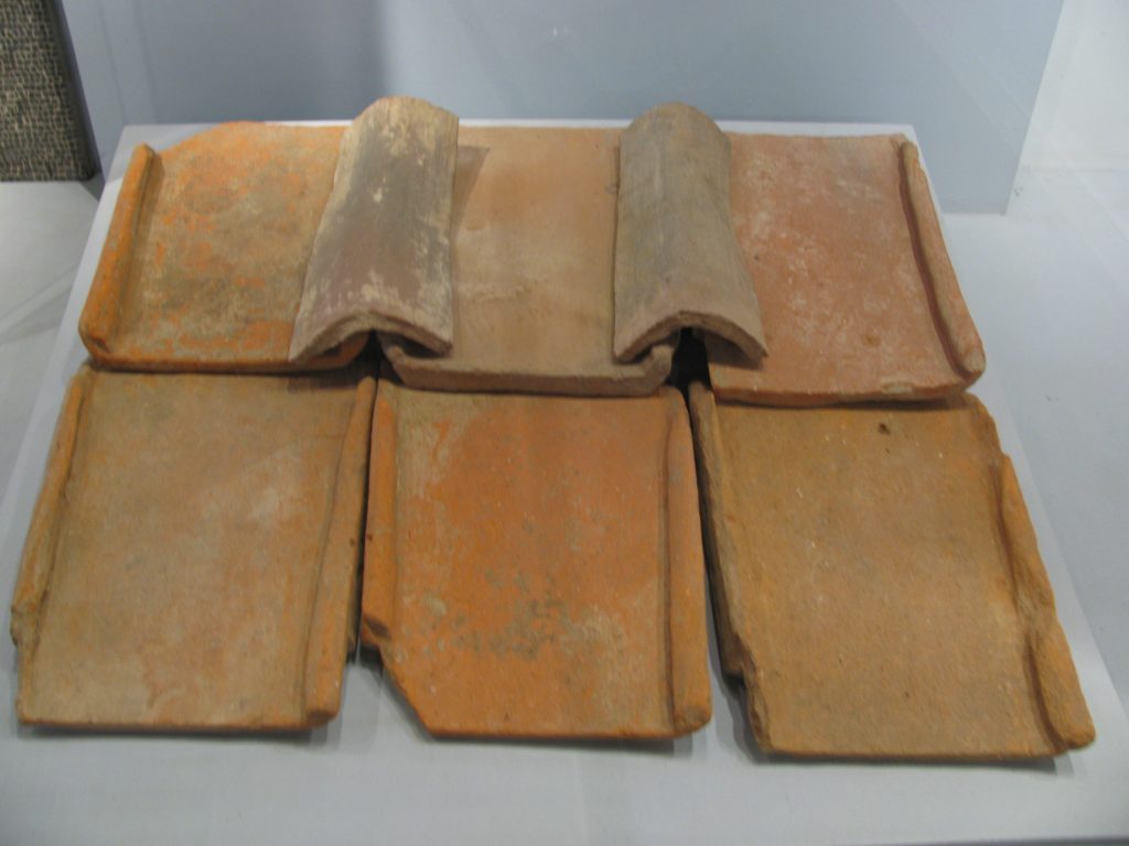 Les tegulae no només s’utilitzaven per a la construcció de cobertes en edificacions; també s’empraven per a cobrir sepultures, com en aquest exemple, on les imbrice (teules tradicionals) relliguen les tegulae (teules planes amb ribet lateral):