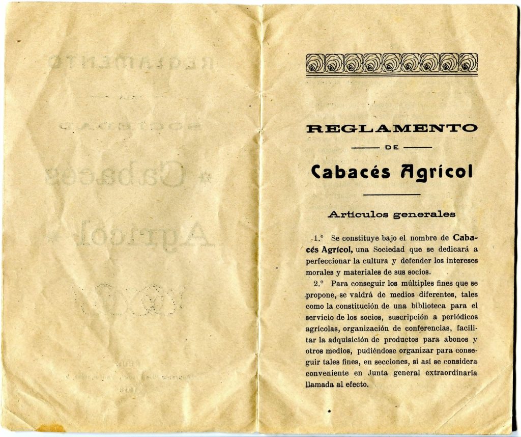 Hi ha, encara, un altre cartell a la fotografia que es pot llegir parcialment: a la dreta de la porta de fusta del fons, i a sota del calendari que acabem de comentar, en un plafó emmarcat s’hi pot llegir “CABACÉS AGRÍCOL”. Podria ser un extracte dels estatuts de l’entitat o una llista de socis: