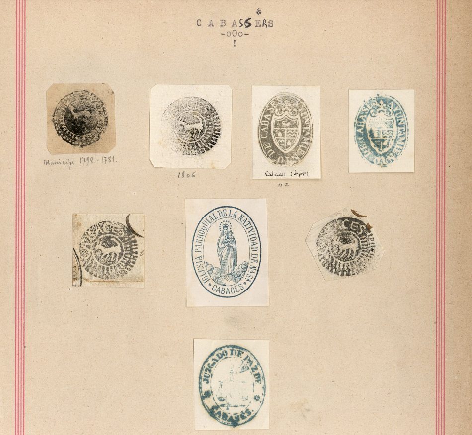 A la col·lecció sigil·logràfica de Catalunya de l’Arxiu Municipal de Barcelona s’hi pot trobar una estampació en tinta de la marca usada per a lacrar els documents baronials reproduïda a la figura 1 del quadre anterior. La marca en qüestió és la primera de la col·lecció de segells de Cabassers conservada a Barcelona, i se li assignen, manuscrites, dues dates: 1798-1781. La marca però, com hem vist abans, és més antiga i s’usava, com ja hem dit, al darrer quart del segle XVII per a marcar la documentació amb lacre.