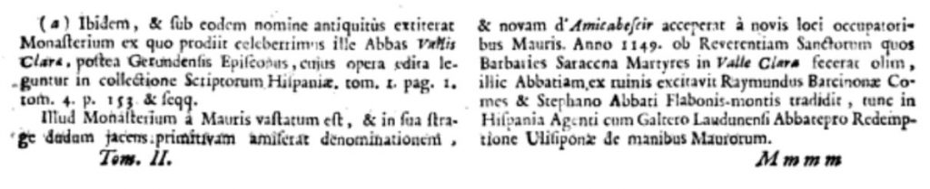Illud Monasterium a Mauris vastatum est, & in sua strage dudum jacens primitivam amiserat denominationem, & novam d’Amicabescir acceperat à novis loci occupatoribus Mauris. Anno 1149, ob Reverentiam Sanctorum quos Barbaries Saracena Martyres in Valle Clara fecerat olim, illic Abbatiam, ex ruinis excitavit Raymundus Barcinonae Comes & Stephano Abbati Flabonis-montis tradidit, tunc in Hispania Agenti cum Galtero Laudinensi Abbatepro Redemptione Ulisponae de manibus Maurorum. (Hugo, 1736, DCXXXIII-DCXXXIV).