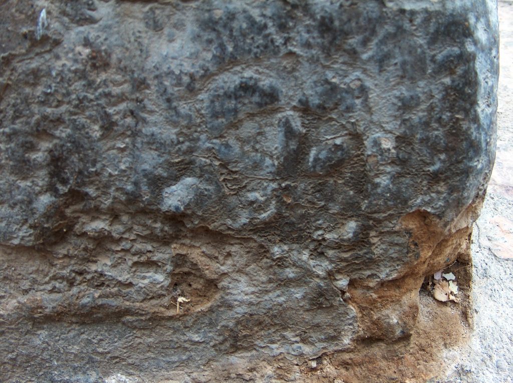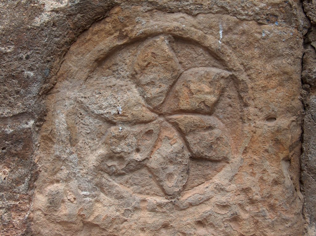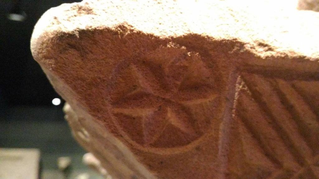 Fig. 4) Relleu sobre un carreu que mostra una estrella de sis puntes amb una rotació igual a la de les agulles del rellotge. El relleu té un diàmetre de 20 cm, i el ribet que el voreja té una amplada de 2 cm.