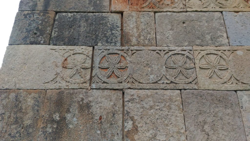 Fig. 3) Relleu sobre un carreu que mostra una tetrasquela del tipus lau buru, amb una rotació en direcció a les agulles del rellotge. El relleu té un diàmetre de 16 cm, i el ribet que el voreja té una amplada de 2 cm.