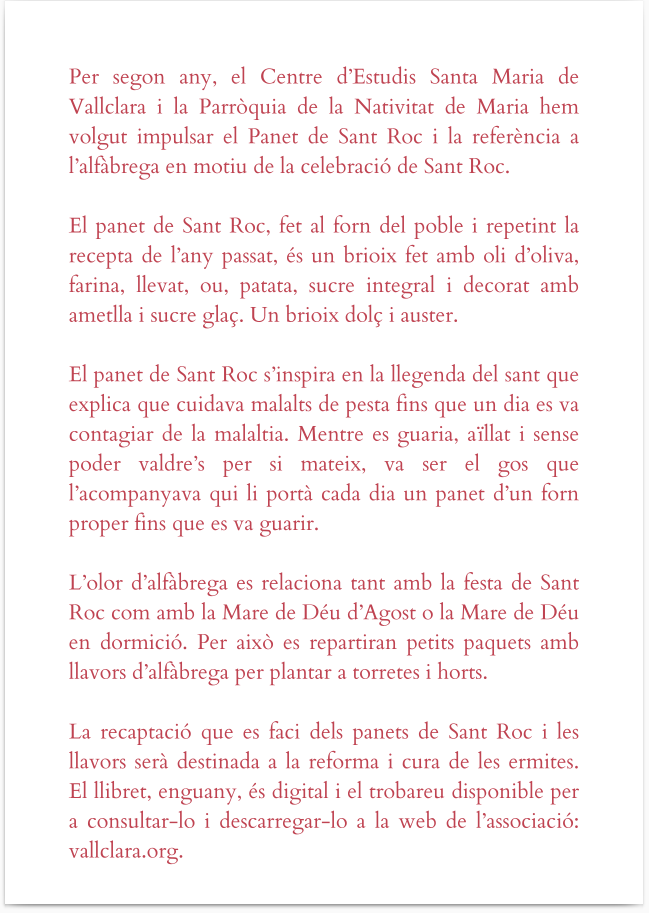 Avui, festivitat de Sant Roc, tornem a celebrar-la amb la benedicció dels panets que rememoren l’aliment que un gos portà al sant mentre estigué malalt de pesta.