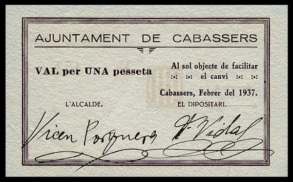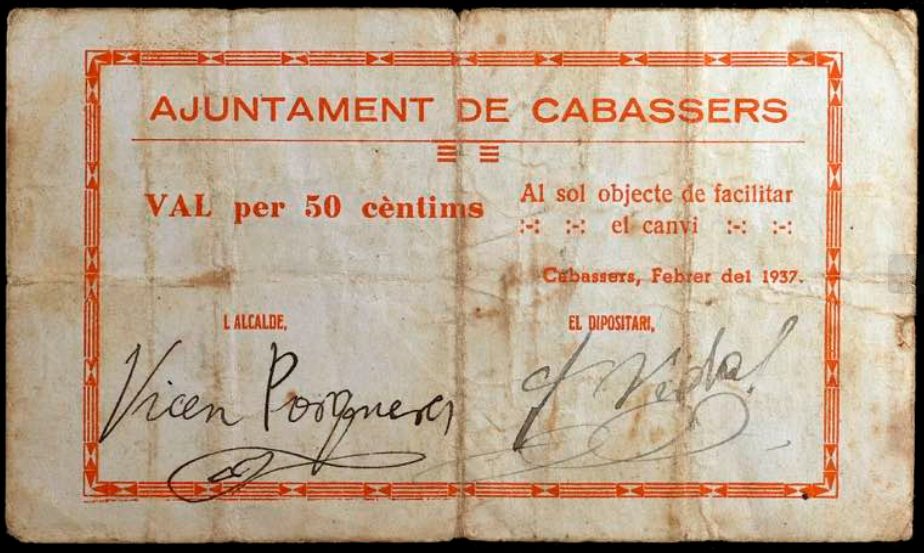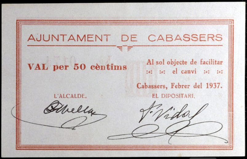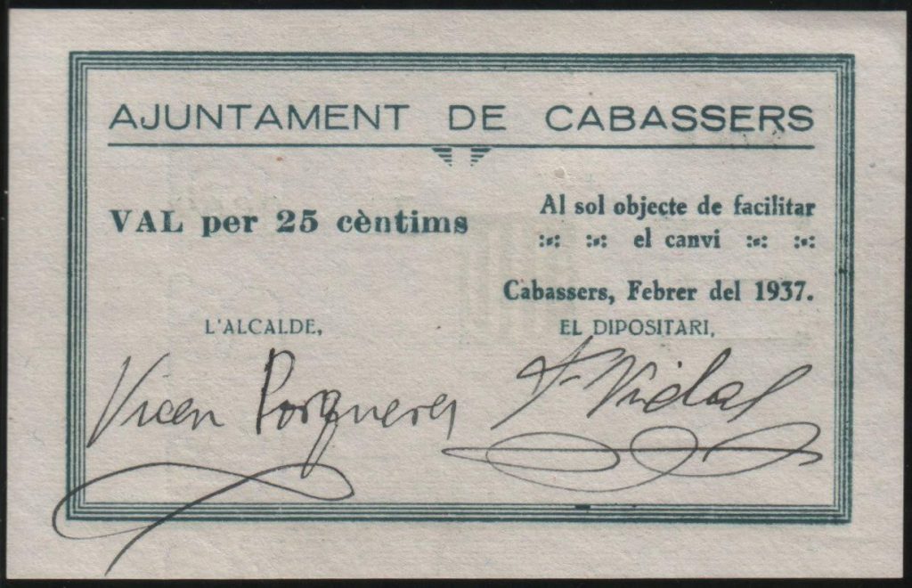 Venciment: 31 de desembre de 1937. Material: Paper de barba blanc. Mides: 65 x 103 mm. Particularitats: Signats a mà amb tinta negra. Segell tampó violeta ovalat “AYUNTAMIENTO DE CABACES” al revers.
